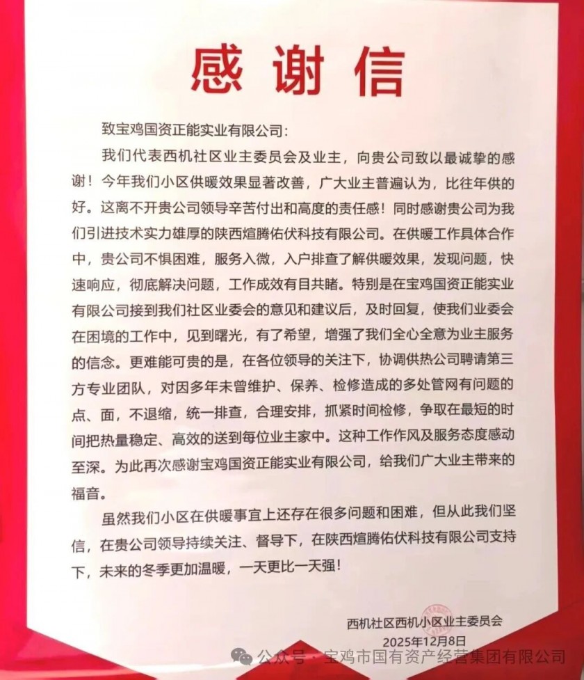 近日,蔡家坡西机颐年园生活区业委会将一封感谢信送到了正能实业公司。信中话语真诚:“今年我们小区供暖效果显著改善,广大业主普遍认为,比往年供的好。”这封承载着居民期盼的感谢信,为解决长达八年的供暖难题写下了暖心注脚。