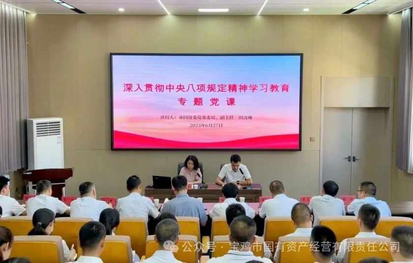 为扎实开展中央八项规定精神学习教育,准确领会中央八项规定及其实施细则精神的核心要义,推动国有企业高质量发展,6月27日下午,市国资委党委委员、副主任田凌琳到宝鸡国资正能实业发展有限公司党总支讲授深入贯彻中央八项规定精神学习教育专题党课。市国资公司党委委员、副总经理、正能实业公司党总支书记冯峰主持会议,正能实业公司领导班子成员、中层管理人员、关键岗位干部、员工代表参加会议。