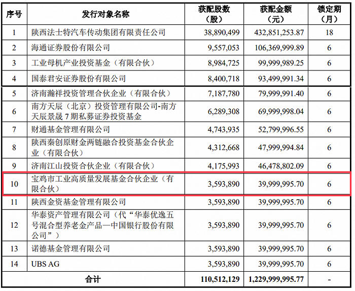2023年6月,由宝鸡市工业发展集团有限公司、宝鸡工发投资本管理有限公司、陕西金资基金管理有限公司共同合作成立的宝鸡市工业高质量发展基金合伙企业(有限合伙)成功参与秦川机床定增,本次发行价格为11.13元/股,募集资金总额约12.3亿元,宝鸡市工业高...