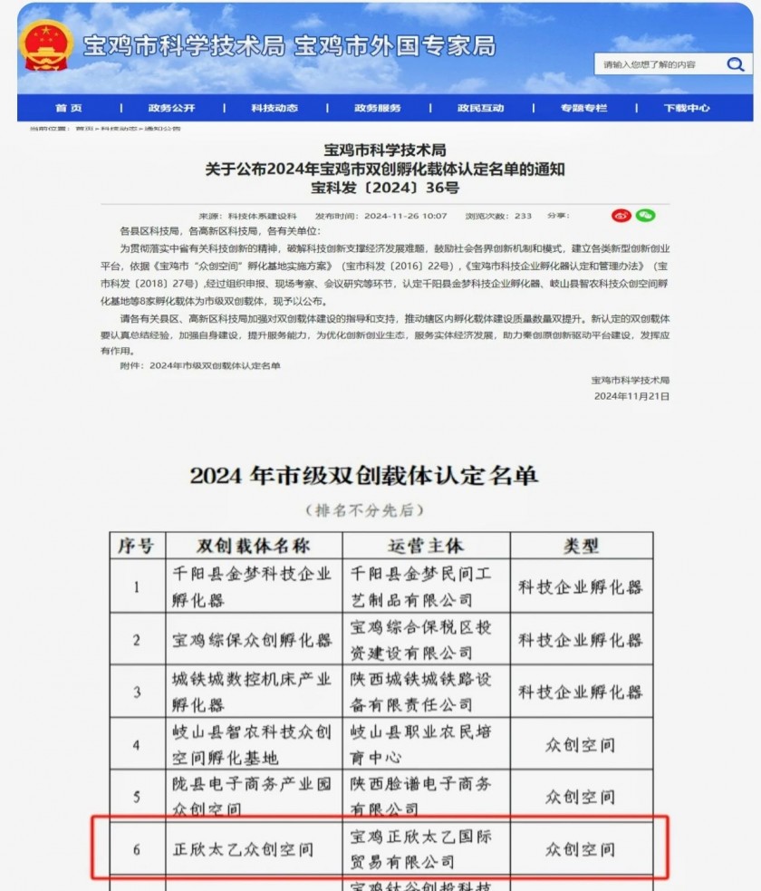 近日,由宝鸡市科学技术局下发《关于公布2024年宝鸡市双创孵化载体认定名单的通知》(宝科发〔2024〕36号)认定宝鸡正欣太乙国际贸易有限公司及其余7家孵化载体为市级双创孵化载体。这一认定具有重要的意义,标志着我市在跨境电商领域迈出了坚实的一步,为推动区域经济高质量发展注入新的活力。